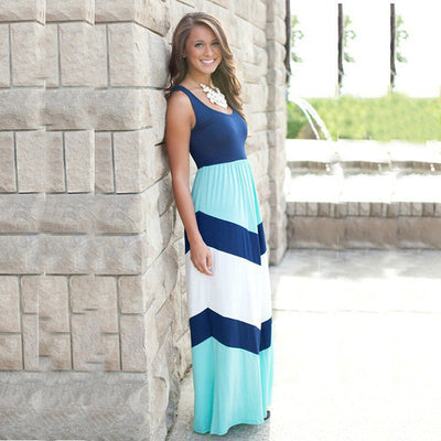 Colorful Striped Print Side Slit Maxi Dress Women Colorblock Sleeveless Slim Long Dresses